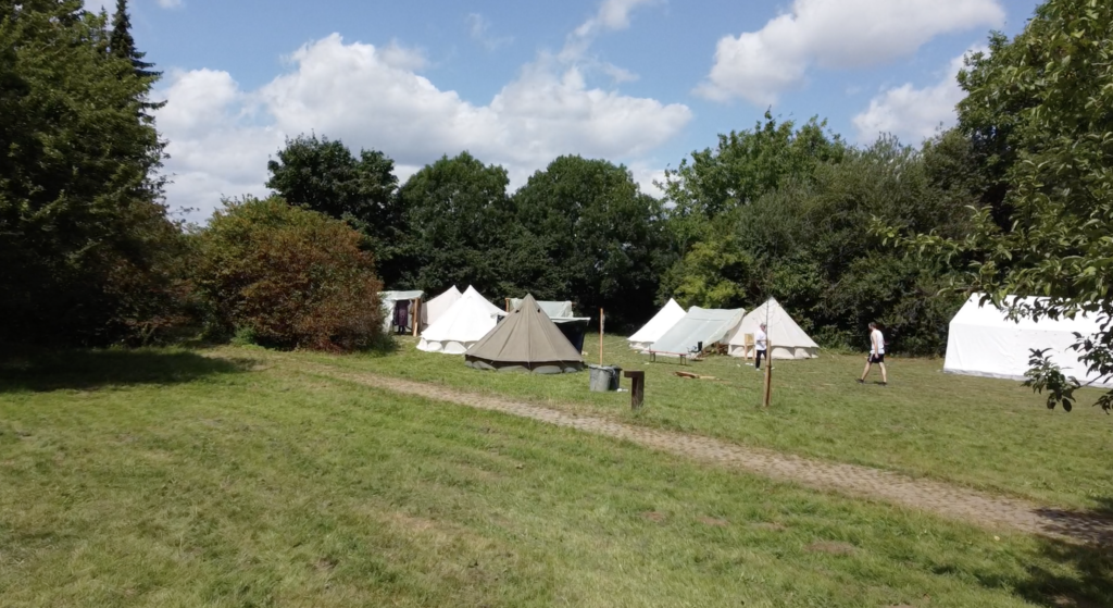 Jeder Lagerplatz bietet uns einen großen Zeltplatz, auf dem sowohl die Jungen als auch die Gruppenleiter/innen in Zelten übernachten, und ein Haus mit Schlafräumen für die Mädchen, Sanitäranlagen und einer großen Küche.